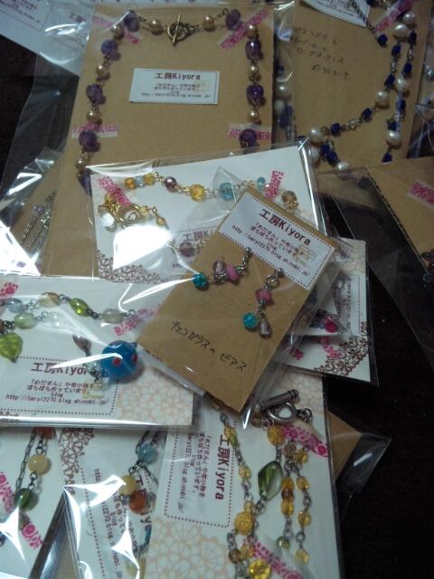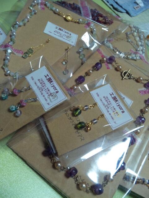 スワロフスキーや天然石のビーズで作ったピアスやネックレスなどを少し。