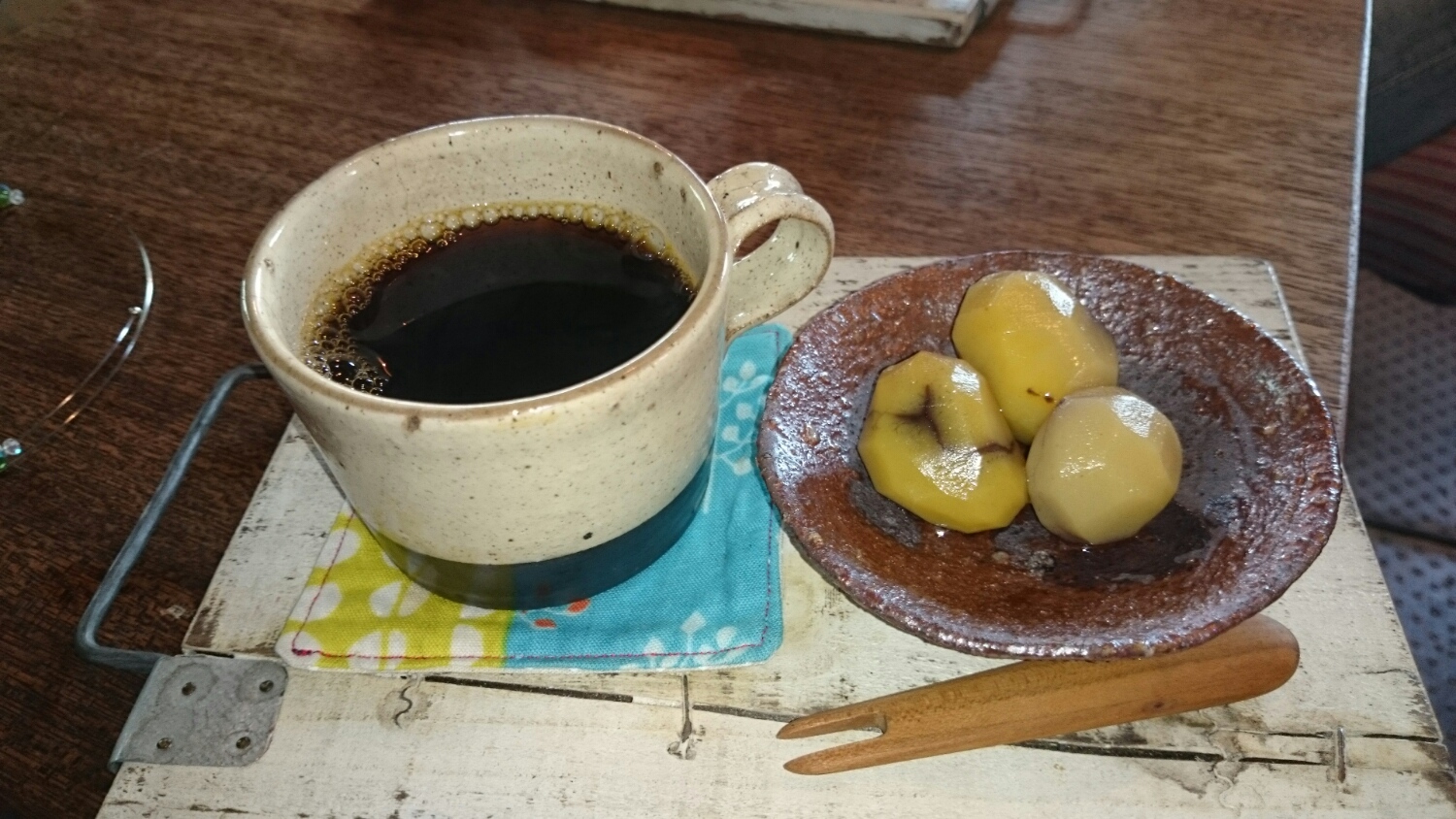 コーヒーか昆布茶が選べて、栗はラム風味か赤ワイン風味かが選べます。
