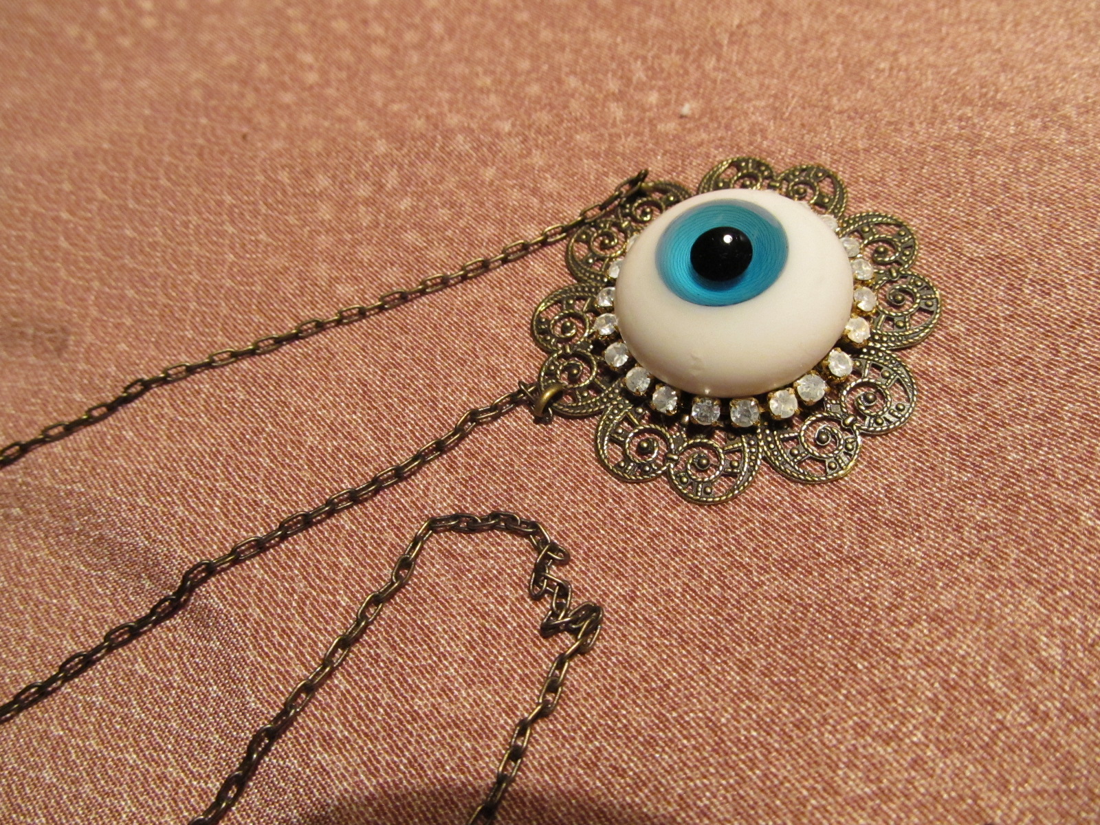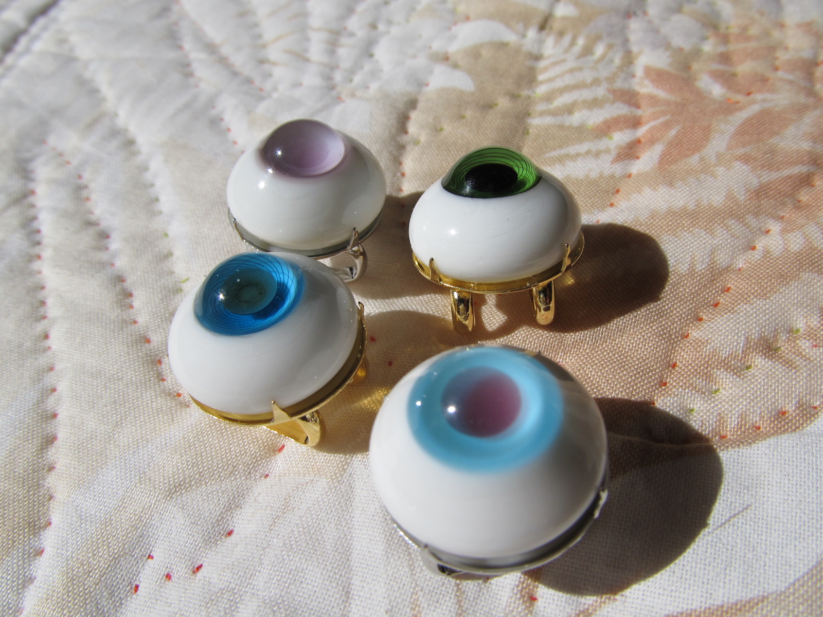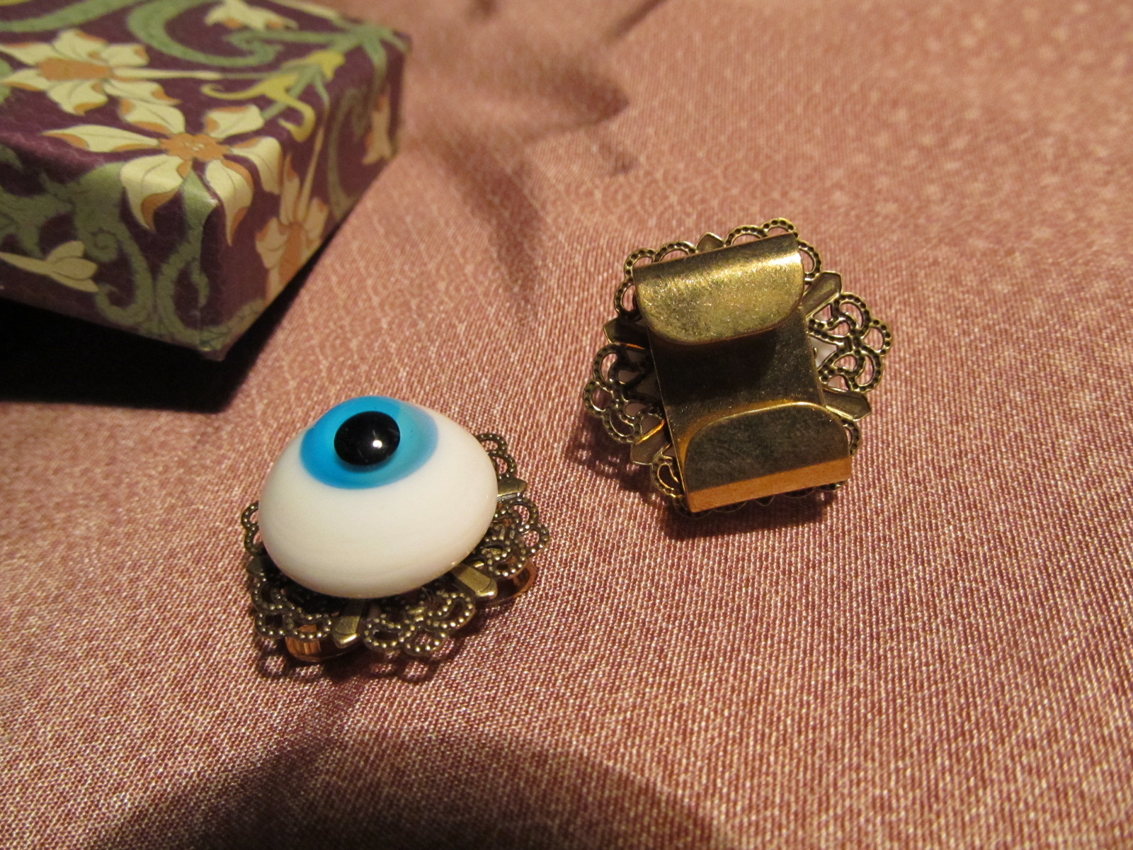 目玉の帯留めやリング、キーリールなど目玉アクセサリー。