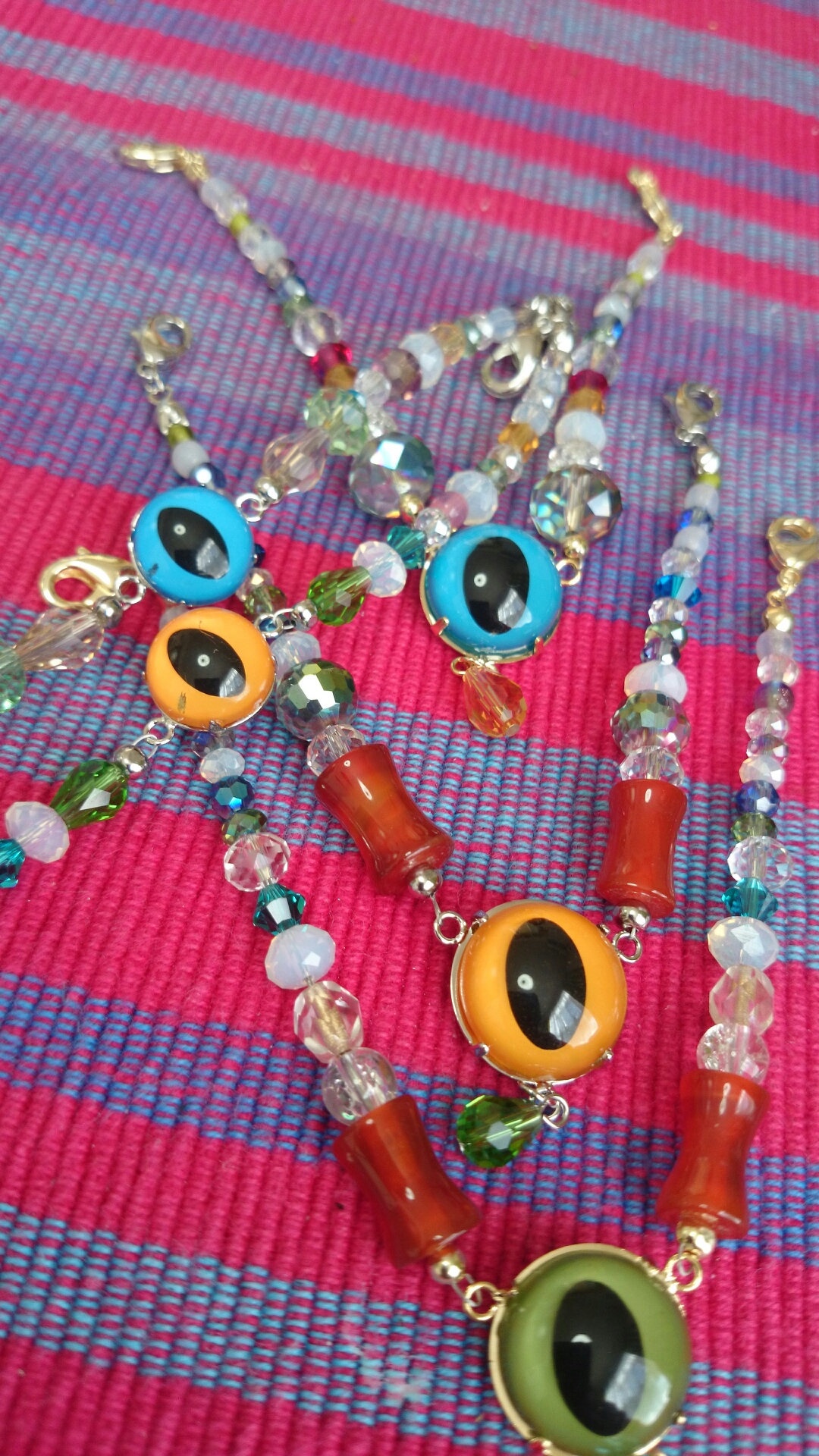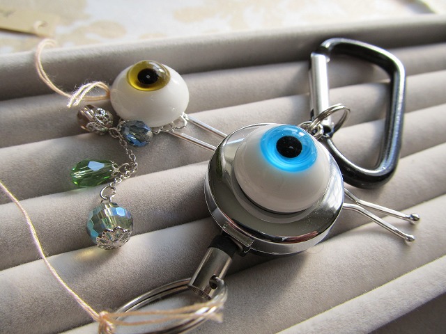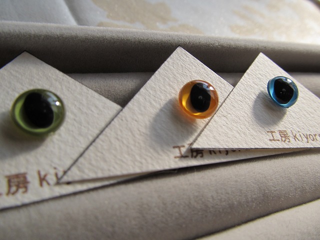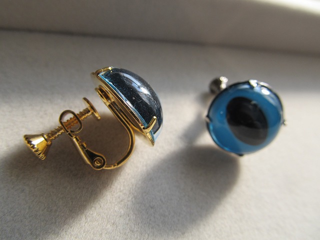 グラスアイのリングやイヤリングや帯留め、帯飾り、ピンバッジなど。