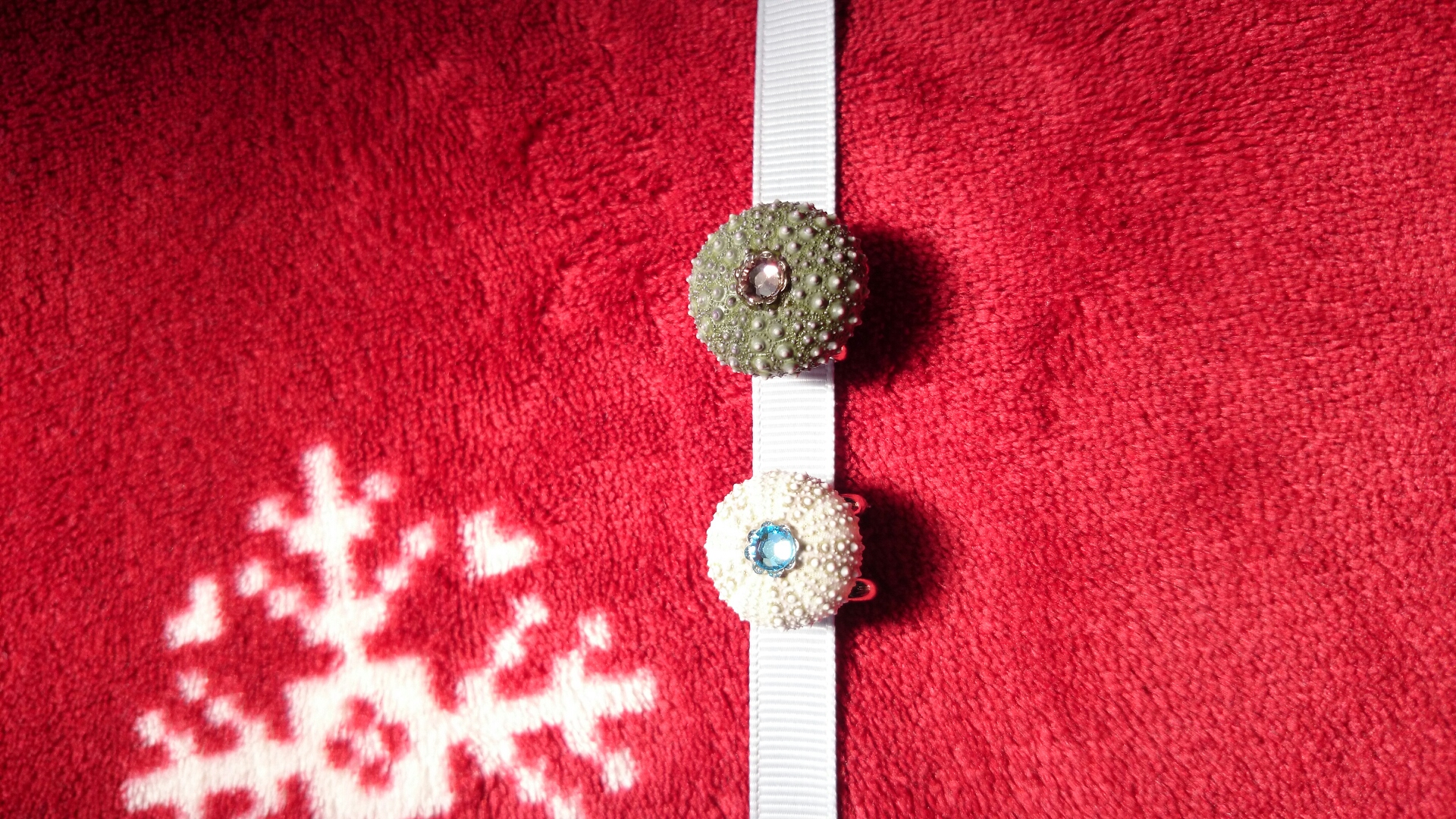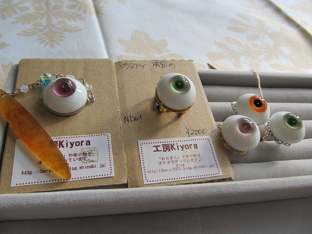 グラスアイの帯飾りと帯留めとリング。各2000円。