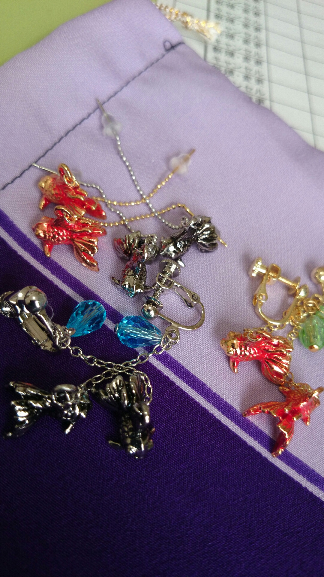 金魚のピアス・イヤリング。これはペア売りですが、赤い金魚のピアス・イヤリング。黒い金魚のピアス・イヤリング。各1ペアずつしか作ってません。