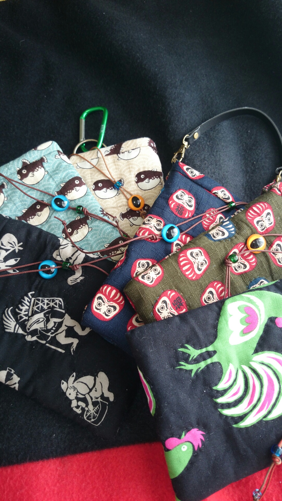 スマホポーチ。バッグや腰に下げられるようにカラビナだったり持ち手だったりがついております。