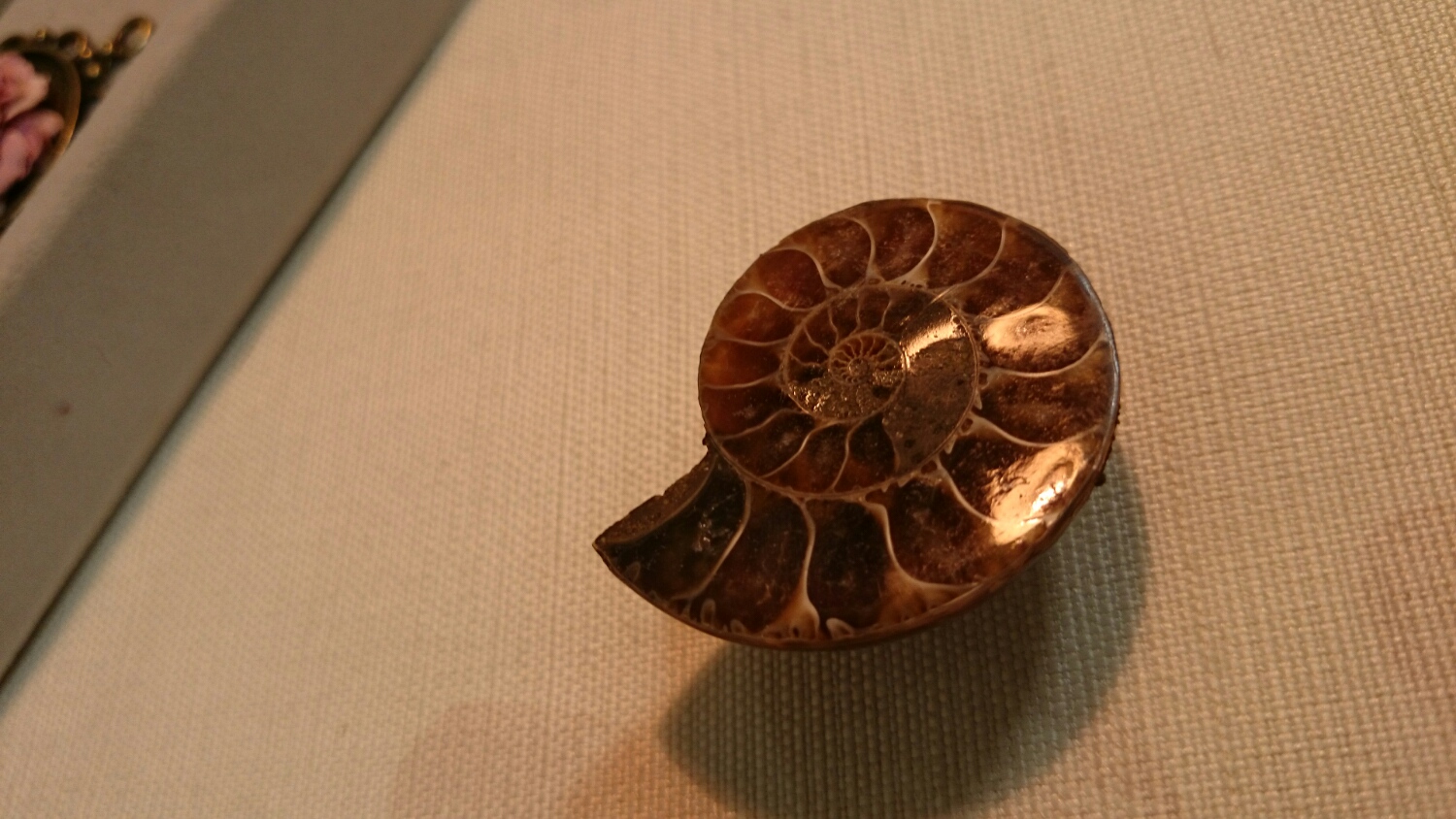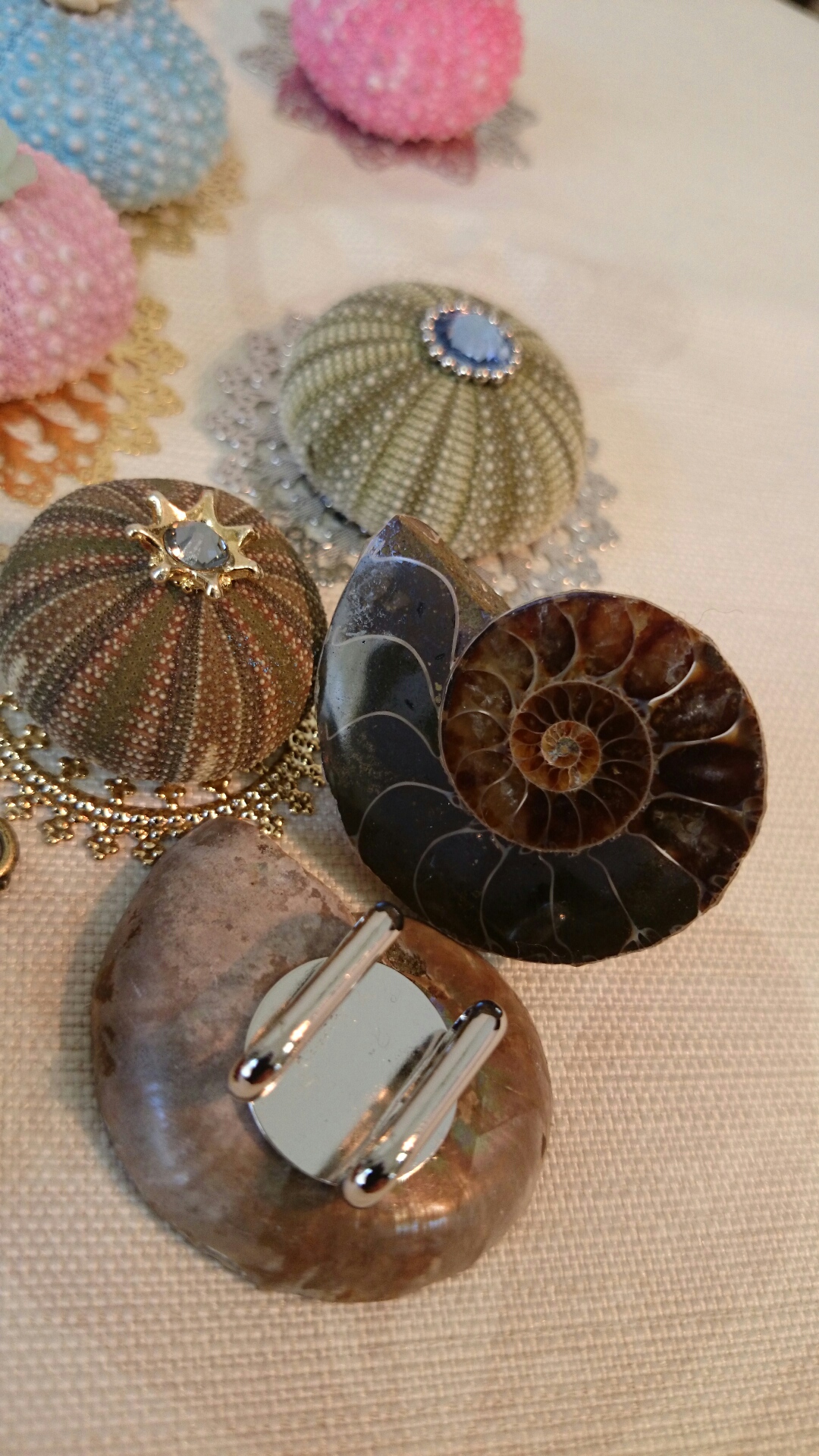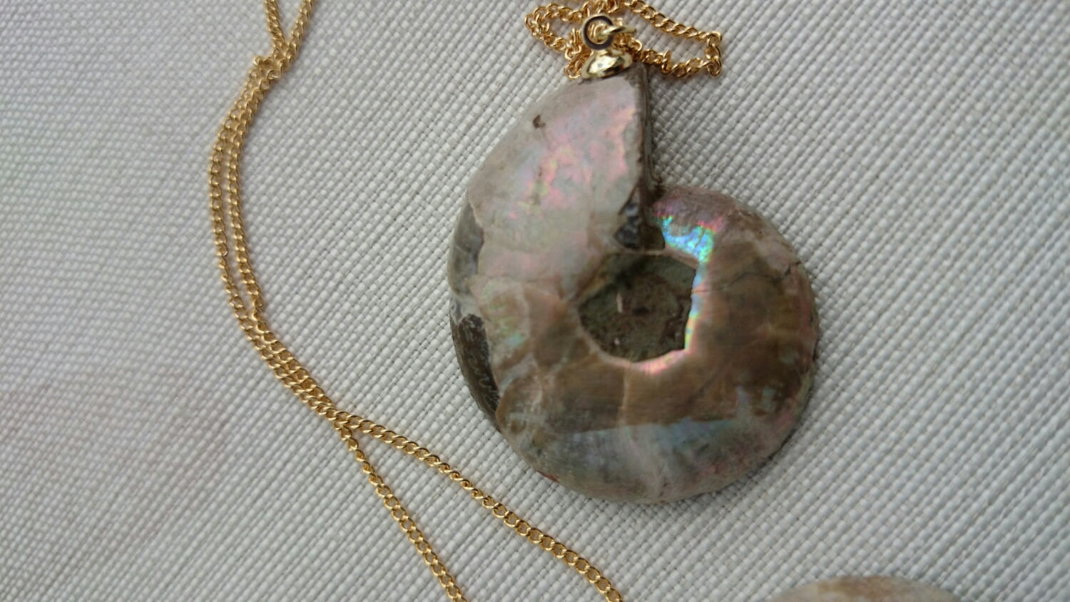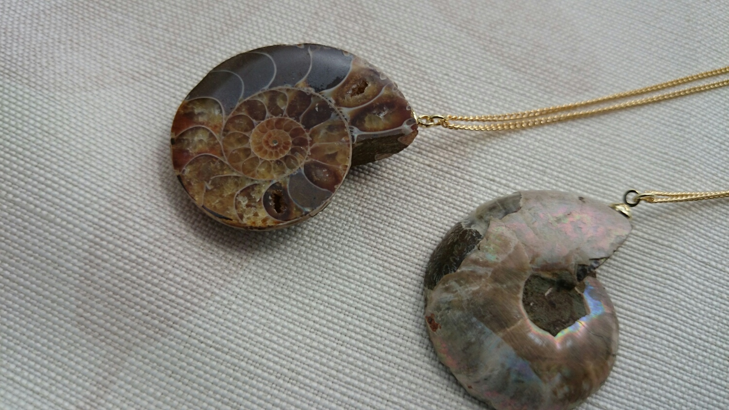 光を通して美しいオパール化したアンモナイトなども、ネックレスにしようかなと。
