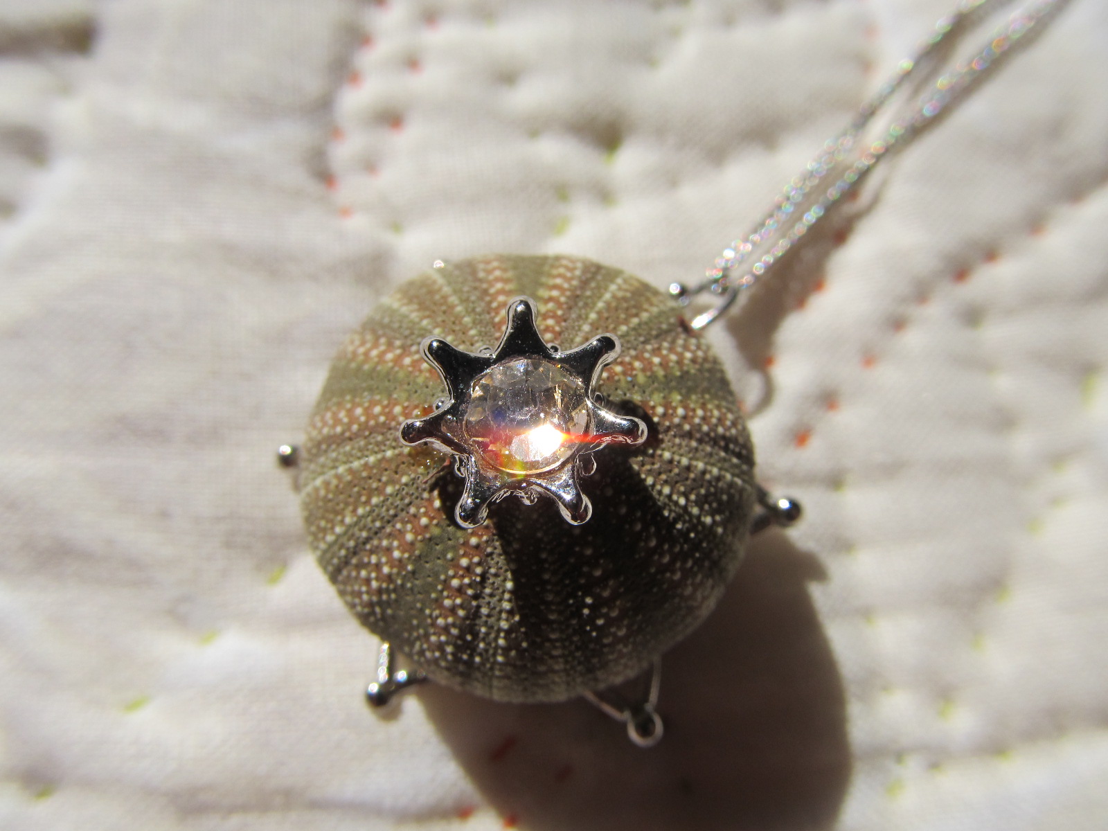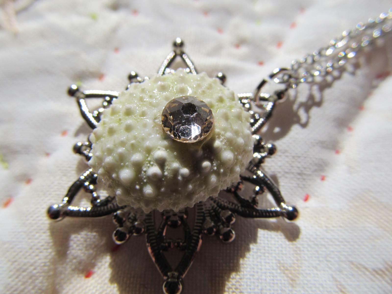 雪の結晶モチーフの上に小さなウニを乗せたネックレス。