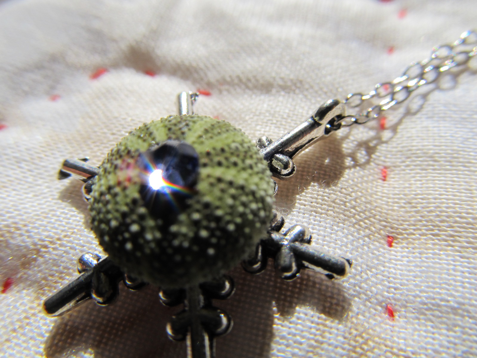雪の結晶モチーフの上に小さなウニを乗せたネックレス。